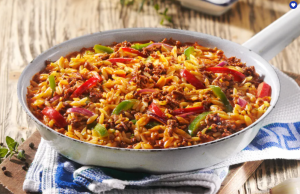 Griechische Rindfleischpfanne10736 Griechenland von seiner köstlichsten Seite: Genießen Sie feine Kritharaki-Nudeln, deftiges Rinderhackfleisch, rote und grüne Paprikastreifen, rote Zwiebeln und viele Kräuter und typische Gewürze – köstlich kombiniert zu einem würzigen Pfannengericht. Schmeckt wie ein Urlaubstag am Mittelmeer! | ![]() |