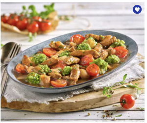 Schweinegeschnetzeltes mit Pfannengermüse10798 Herzhaft, würzig – einfach köstlich: Saftiges Schweinegeschnetzeltes, bereits gewürzt und gegart, auf einer knackigen Gemüsemischung mit gegrillten Zwiebeln, Cherrytomaten und Romanesco in einer Kräutersoße. Schmeckt so gut, wie es sich anhört! | ![]() | |